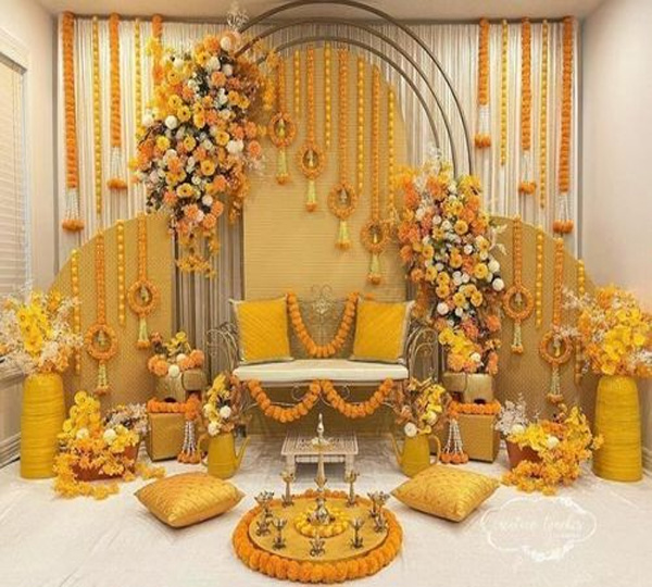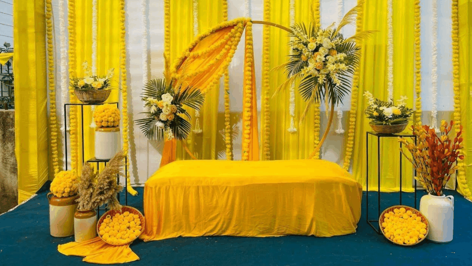 Brighten your Haldi ceremony with vibrant yellow hues, floral elements, and traditional touches that bring joy, warmth, and celebration alive.